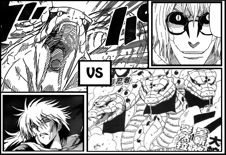 Los ninjas de Tatsu se disipan a distintas partes, pero donde se encontraban los Jinchūriki, comienzan a verse unas siluetas llamativas listas para batallas en cada división, entonces dentro de la Arena de Satsujin detonan una especies de bombas, y los dragones de Namu son cortados por una especie de hilo de alambre, Akane y Toketsu son detenidos por unas Marionetas robustas, Shinya detiene su veloz ataque ante un espadachín singular equipado con decenas de espadas y Gohan se detiene ante un ninja robusta de risa lunatica. D es enfrentado por un fila de ninjas que se disponen a hacerle frente, y Fubuki quien enfrentaba a su nieto Shitsu, cuando estaba por vencerlo aparecen sus otros nietos Keisuke y Ryosuke aparecen para enfrentar los tres a su abuelo. En medio del climax, desde lejos a lo alto de un monte una bífida presencia se hace protagonista, siendo Kabuto quien reapareció tras tanto tiempo, acompañado de tres revividos